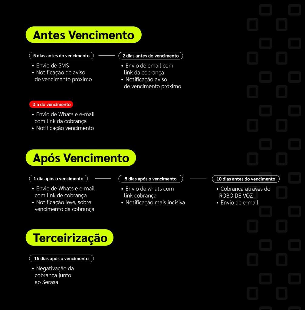 Nesse momento, é importante contar com um roteiro de notificações enviadas de maneira automática ao cliente por e-mail e WhatsApp, lembrando que a cobrança vence em breve, ou que consta em atraso. Assim, prevenindo o esquecimento e contribuindo com a diminuição da inadimplência.